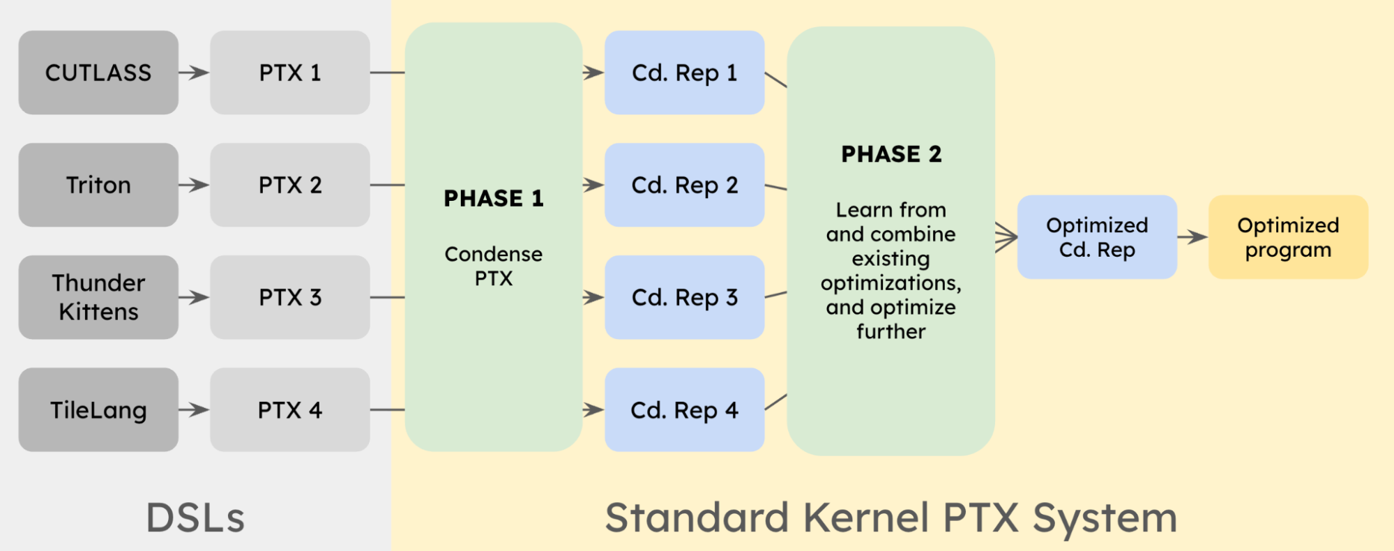 We built a hybrid system where program analysis and LLMs work together to transform and optimize PTX. By operating and reasoning at the shared PTX layer across DSLs (e.g. Triton, TileLang, ThunderKittens, CUTLASS), our system learns and combines optimizations to generate kernels that outperform all individual DSLs.