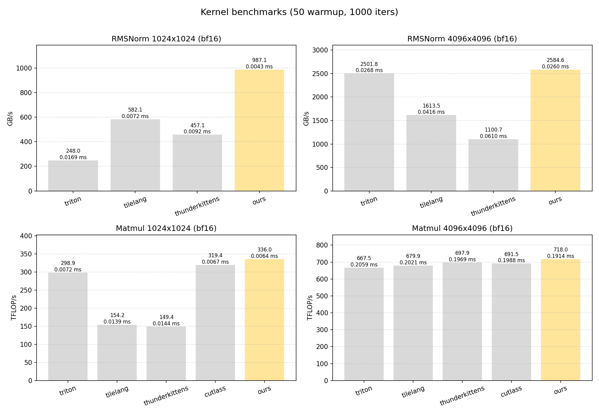 - RMSNorm-1024 is consistently faster than the fastest baseline (TileLang) by ~67%